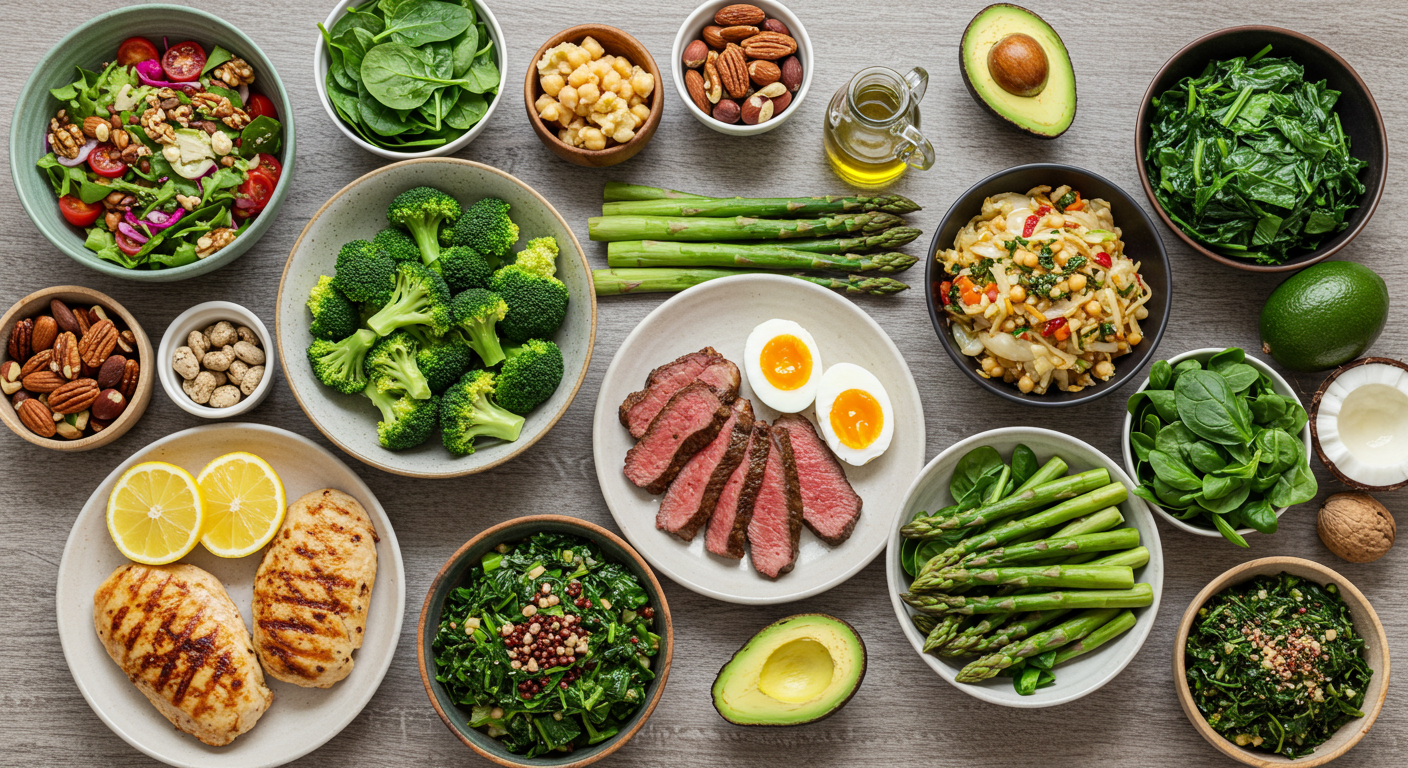 탄수화물은 저탄수화물 채소 위주로 섭취하면서, 잎채소, 브로콜리, 양배추, 아스파라거스와 같은 영양소가 풍부한 식품을 선택하세요. 이러한 채소들은 필수 미네랄과 비타민을 제공하면서도 혈당 영향이 적습니다.